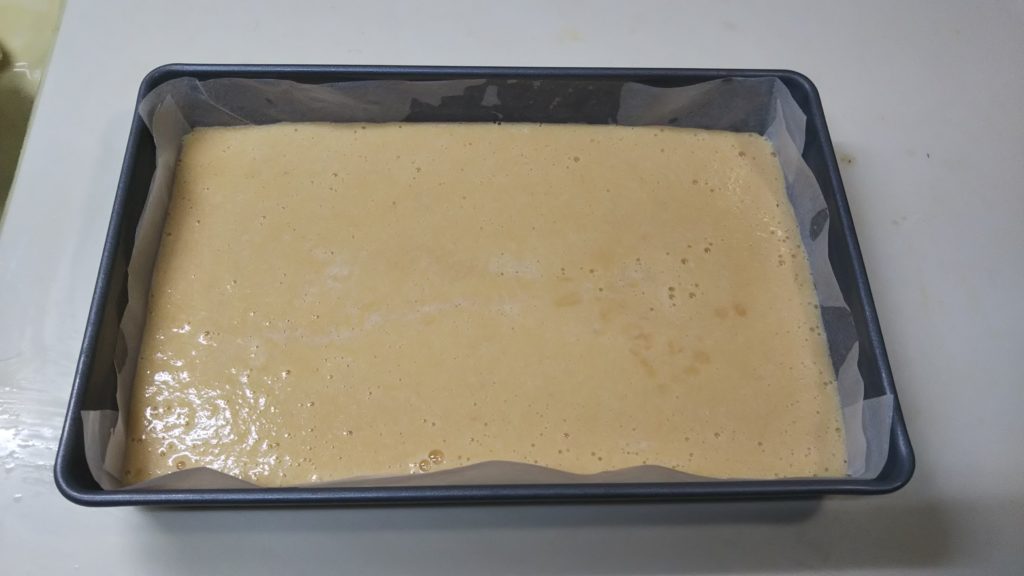 2. クッキングペーパーを敷いた型に流し入れ、オーブンで25分焼く