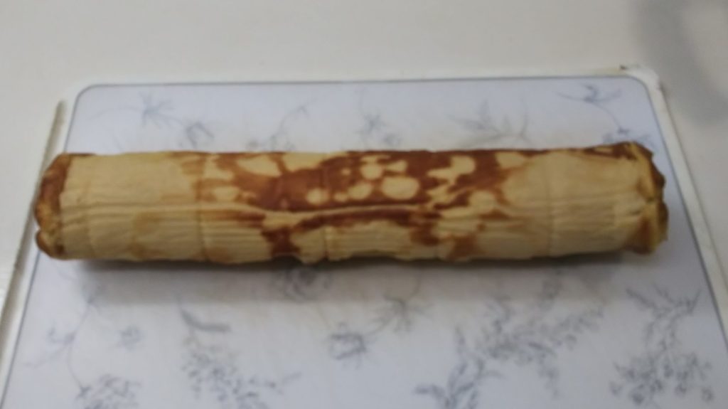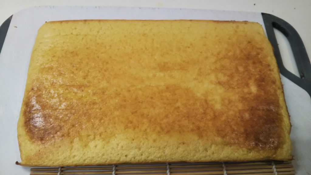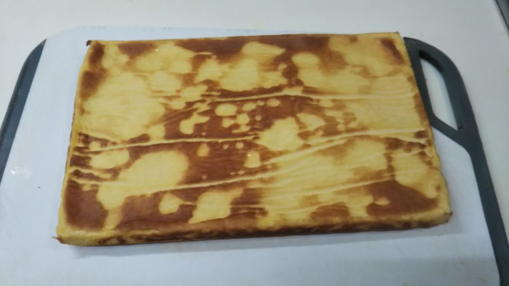 4. 3.の粗熱が取れたら、焦げ目が少ないほうを上にして巻きすの上に乗せる