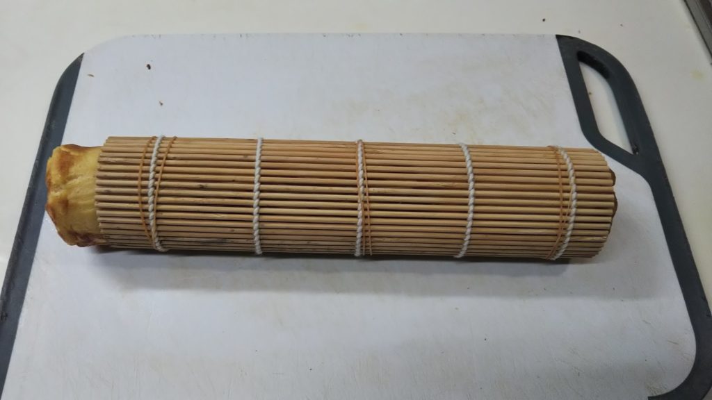 3. 巻きすを手前から巻いていき、巻き終わったら3か所タコ糸または輪ゴムで結び、冷蔵庫で冷やす