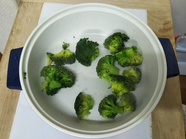 1. ブロッコリーは小房に分けて水洗いし、少量の水と共に耐熱容器に入れて電子レンジで1分半~2分ほど加熱する。その後冷水に取って色止めし、水を切っておく