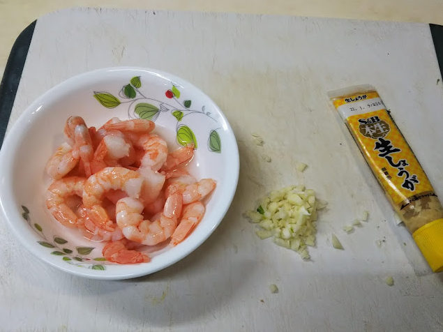 2. 海老は皮を剥いて背ワタを取り、塩少々と酒を振りかけ揉みこんでおく。ニンニクと生姜は微塵切りにしておく。