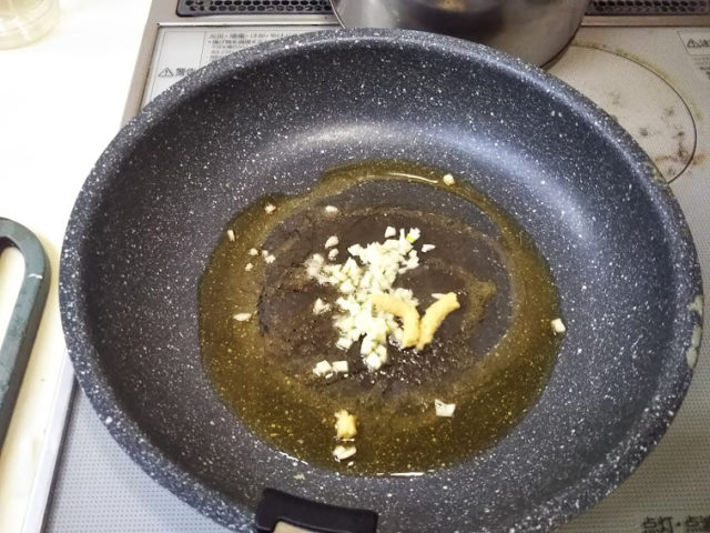 3. フライパンに油を敷き、微塵切りにした生姜とニンニクを焦がさないように異端る