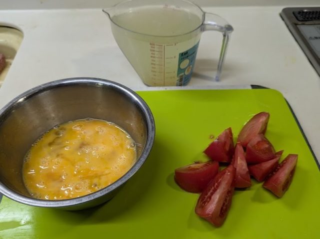 リモートシェフで紹介されていた中華風玉子ごトマトのスープを作ってみました。元のレシピはフライパンにグレープシードオイルとラードを熱した中に卵を入れるのですが、ごま油で代用しました。レシピはリモートシェフのサイトを参考にしました。