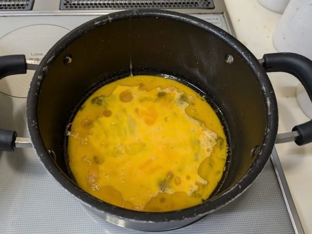 2. 鍋にごま油を熱し、卵液を流し入れる
