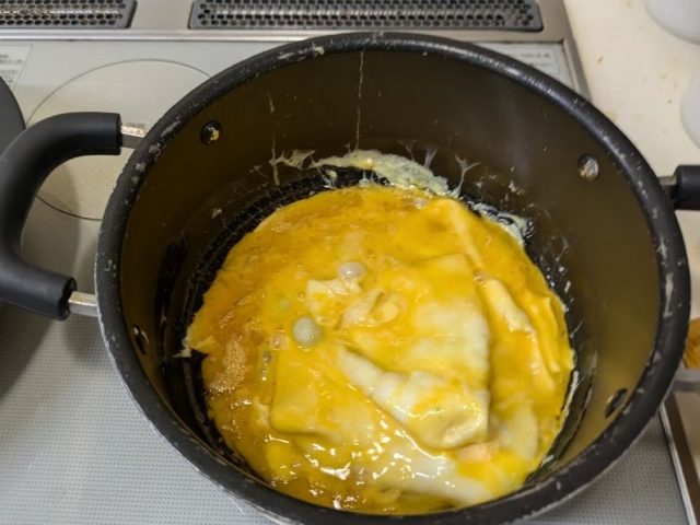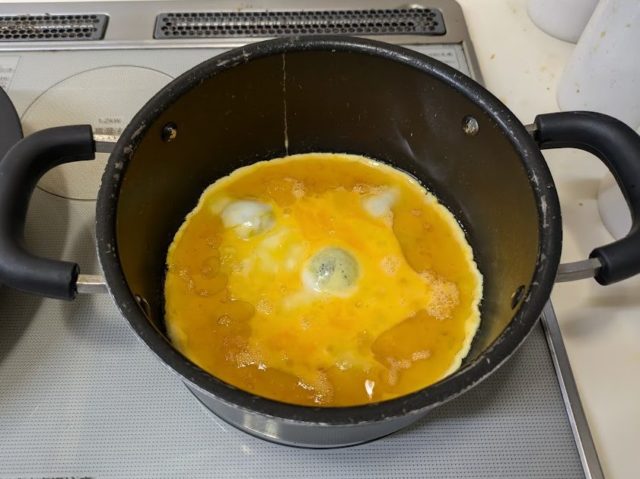 3. 流し入れた卵はそのまま混ぜないで、膨らんでくるのを待つ