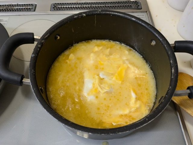 5. 玉子の表面が固まらないうちに、Aのスープを加える