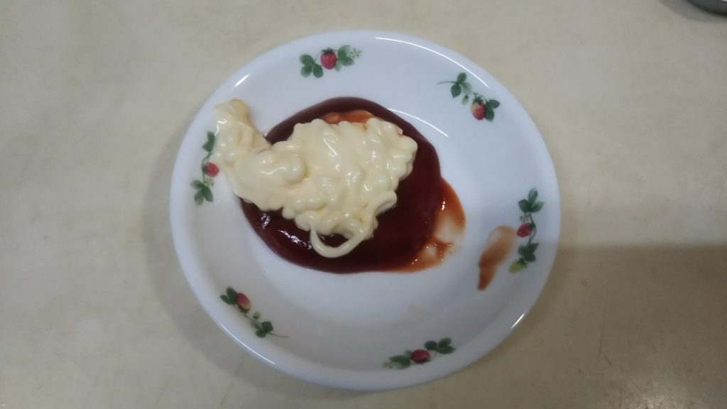ポテトに添えるソースはマヨネーズとかケチャップなどなんでもいいのだそうです。今回はサムライソースとレッドチェダーのシュレットチーズを使ったチーズソースを作ってみました。