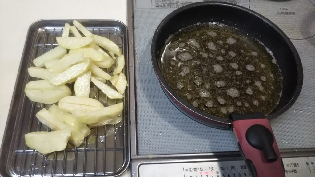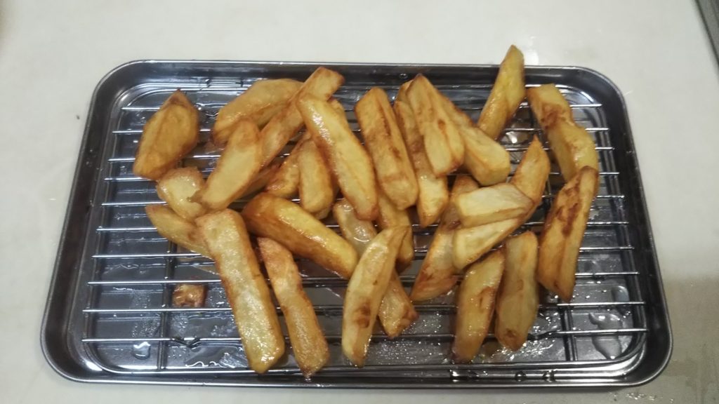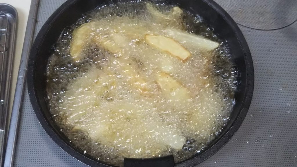 フライドポテトのことです。英語ではFrench fry、フランスの揚げ物って意味ですが…そもそもポテトを油で揚げるのはベルギーが発祥なのだそうです。ベルギーの人がアメリカでポテトを揚げることを教えた時、フランス語を話していたので、教えてもらったほうはフランス人だと思い込み、フレンチフライと名付けられてしまったそうです。それについてはベルギー人ははなはだ遺憾なんだそうです。我々が知っているフライドポテトと違うのは二度揚げするところくらいです。