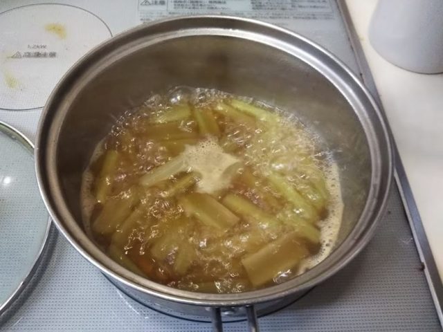 2. 鍋に水を沸かし、塩、砂糖、醤油、酒を入れてだし汁を作り、蕗を煮る