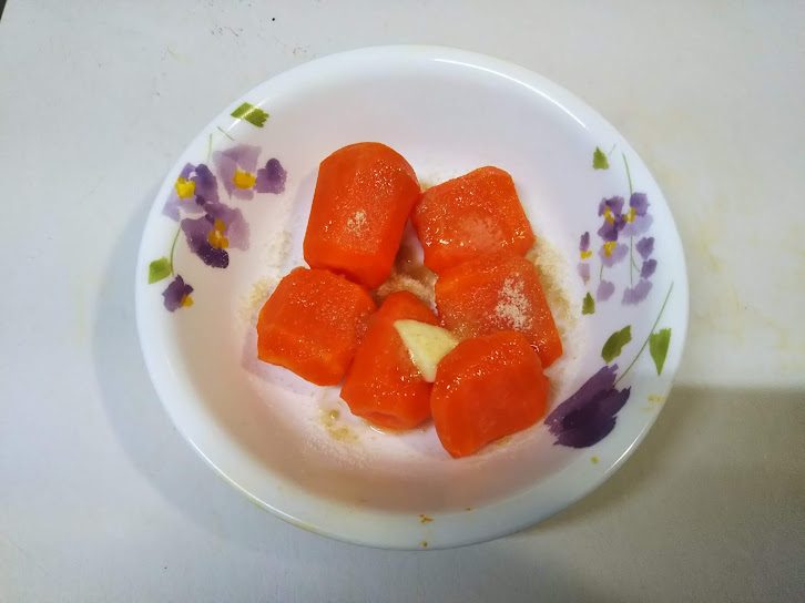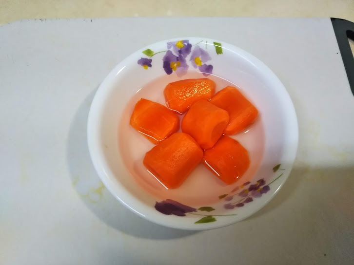 3.耐熱皿に人参と湯を入れ、ラップをして電子レンジで2分加熱する。