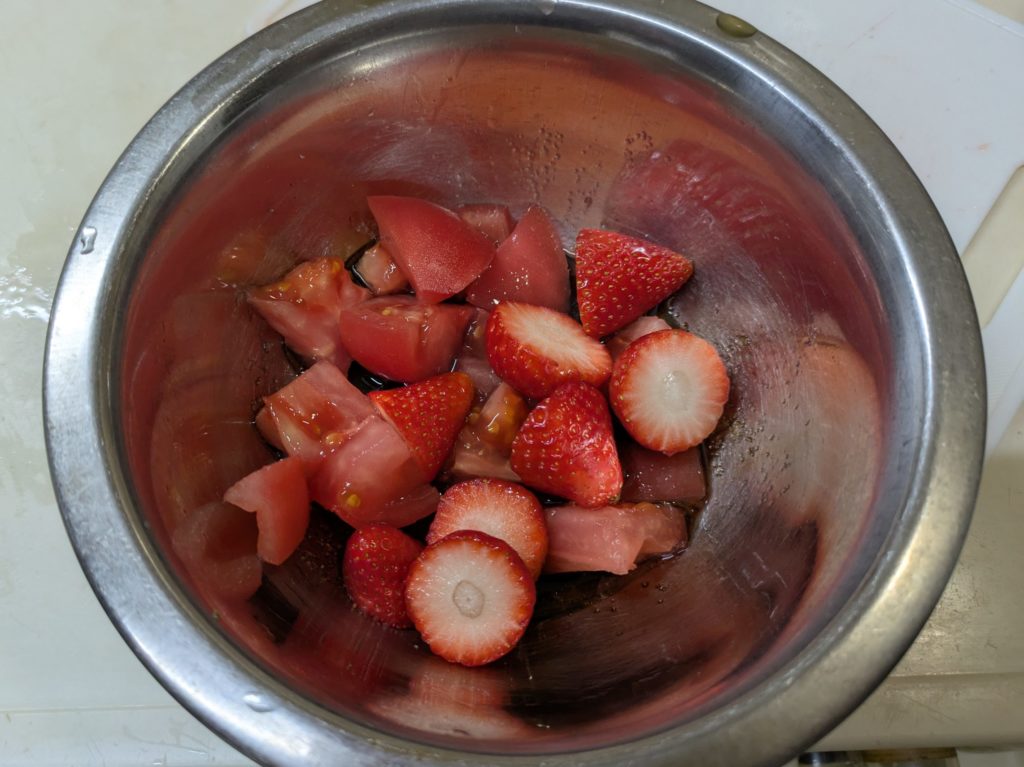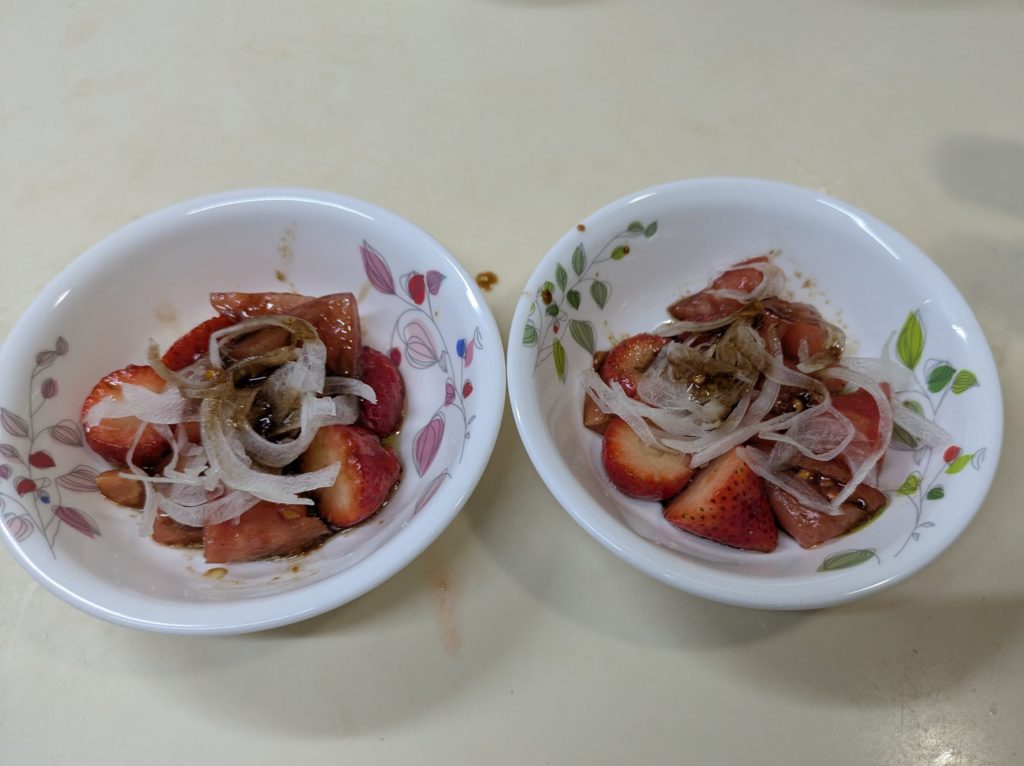 リモートシェフで紹介されたサラダを作ってみました。いちごをサラダに使うのはなんかもったいない感じですが、意外と美味しかったです。放送では生玉葱を使っていましたが、普通の玉葱で作りました。ドレッシングの量も具体的には示されてませんでしたが、そこは、私流で。