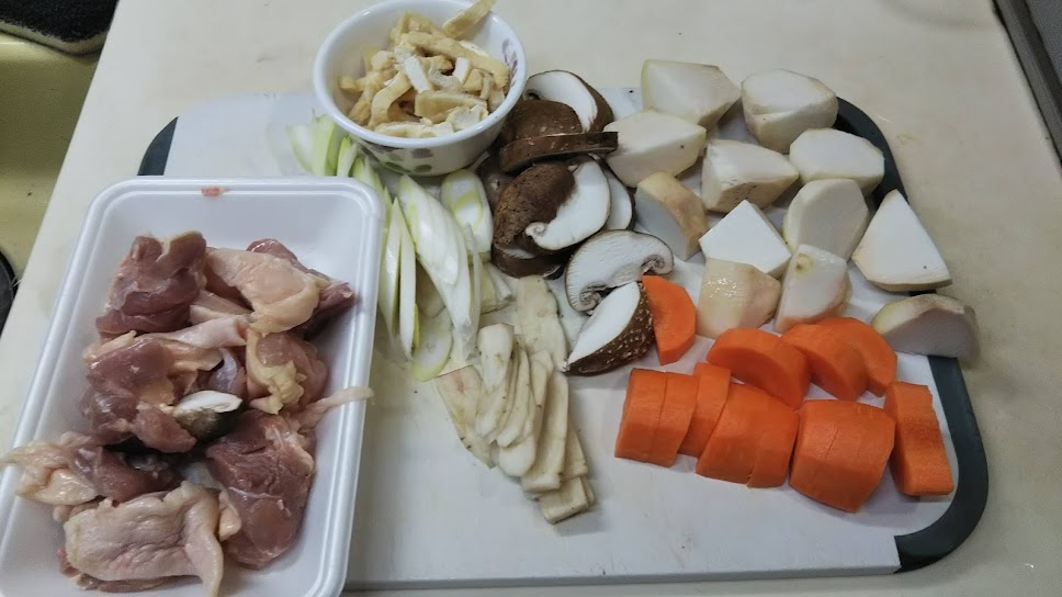1.鶏肉は一口大に切り、里芋と人参は皮を剥いて適当な大きさに切る。牛蒡と葱は斜め切り、椎茸はそぎ切り、油揚げは線切りにする。
