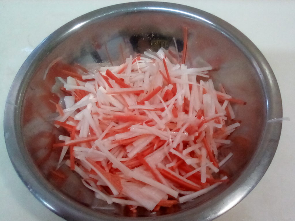 おせち料理の一つで最近ではあまり評判の良くないメニューのようです。我が家では子ども達は見向きもしませんが、夫が何故かすごく好きで毎年作っています。作り方自体は簡単なのですが…やはり最近の人は酢の味がダメなのでしょうかね。でもお寿司は今でも人気があるのに(笑)。日本では赤と白の組み合わせは縁起がいいと思われているため年の初めに紅白のものを食して縁起をかついだのだと言われています。