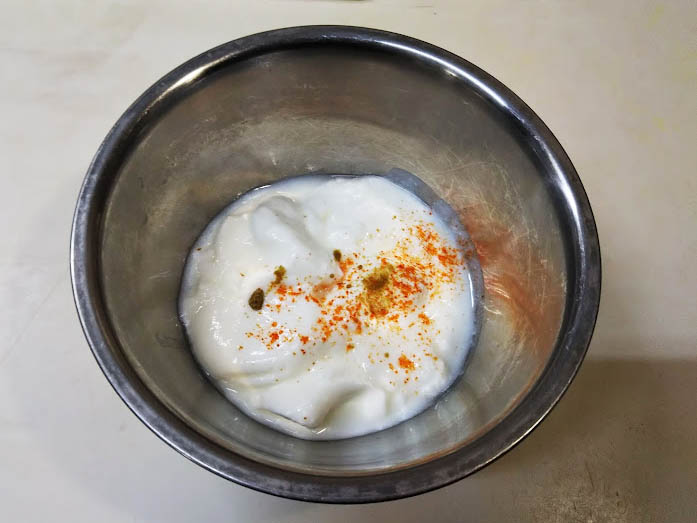 2. ボウルにヨーグルトと塩、スパイス類を入れて混ぜ合わせる