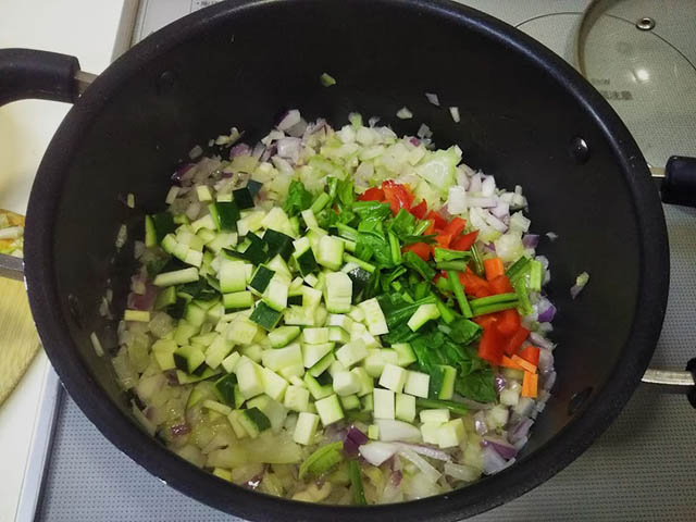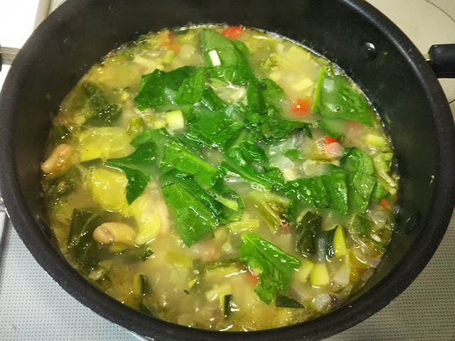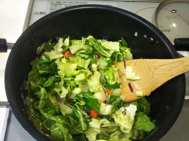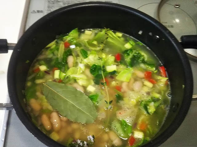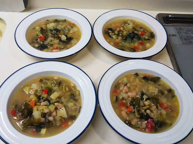 リボリータに必ず入っているものは白隠元豆と黒キャベツだそうです。日本では黒キャベツが手に入らないため、普通のキャベツを使い、彩を出すためにほうれん草も追加してみました。