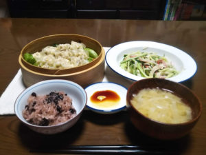 カニカマと胡瓜のサラダと一緒に、ご飯に味噌汁という和食によく合います。