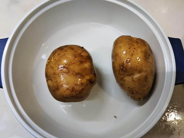 1. じゃがいもは洗って4つに切り、耐熱容器に入れて電子レンジで柔らかくなるまで加熱する。熱いうちに濡れ布巾で皮を剥いてマッシュする