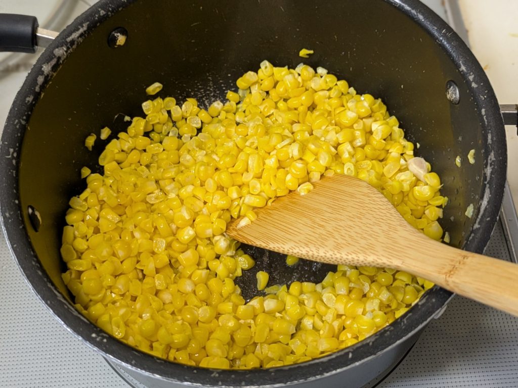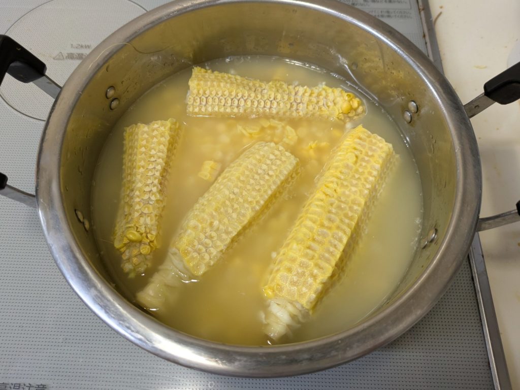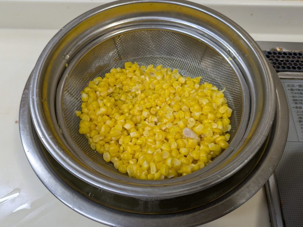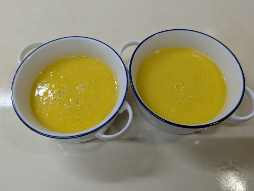 いわゆるコーンスープとかコーンポタージュといわれるものですが、ブイヨンやコンソメスープの素を加えず、牛乳も生クリームも加えない水と塩だけを加えたスープ、これはかなり感激ものです。リモートシェフで紹介されていたとうもろこしのスープ、私は現在ハンディーブレンダーが壊れてしまったので、フードプロセッサーを使いましたが、ブレンダーをお持ちの方はそちらを使うほうをお勧めします。手間がかからないし、洗い物も少なく済みますから。
