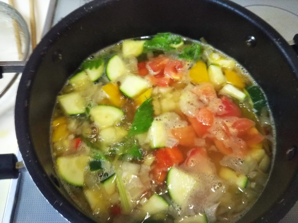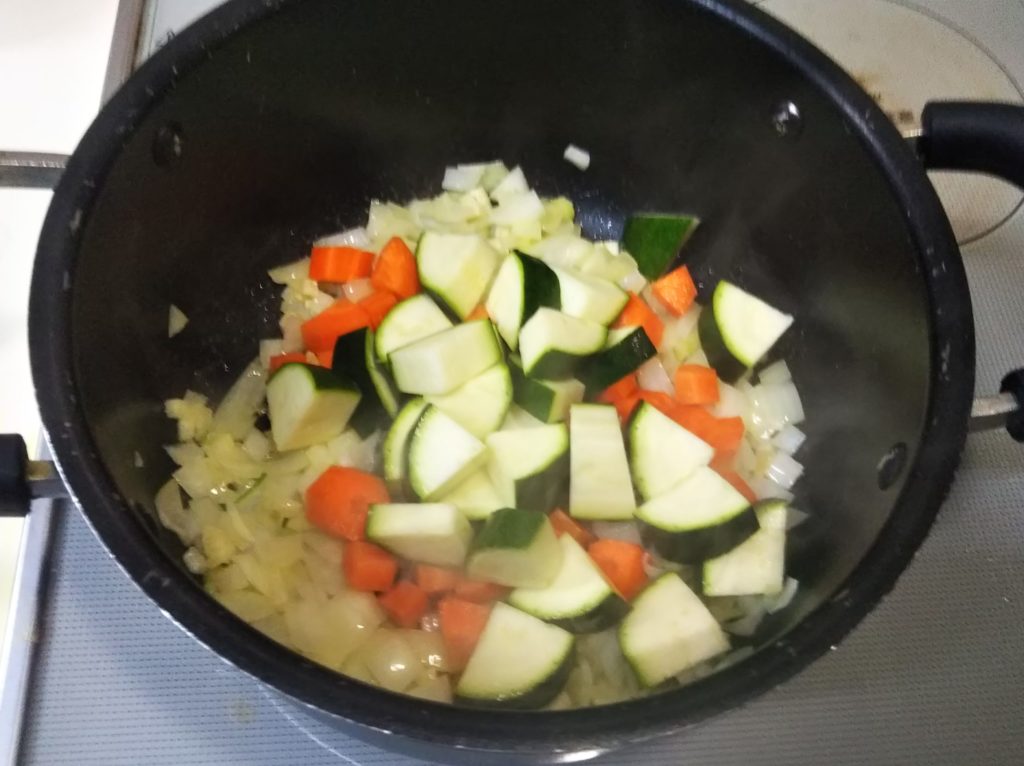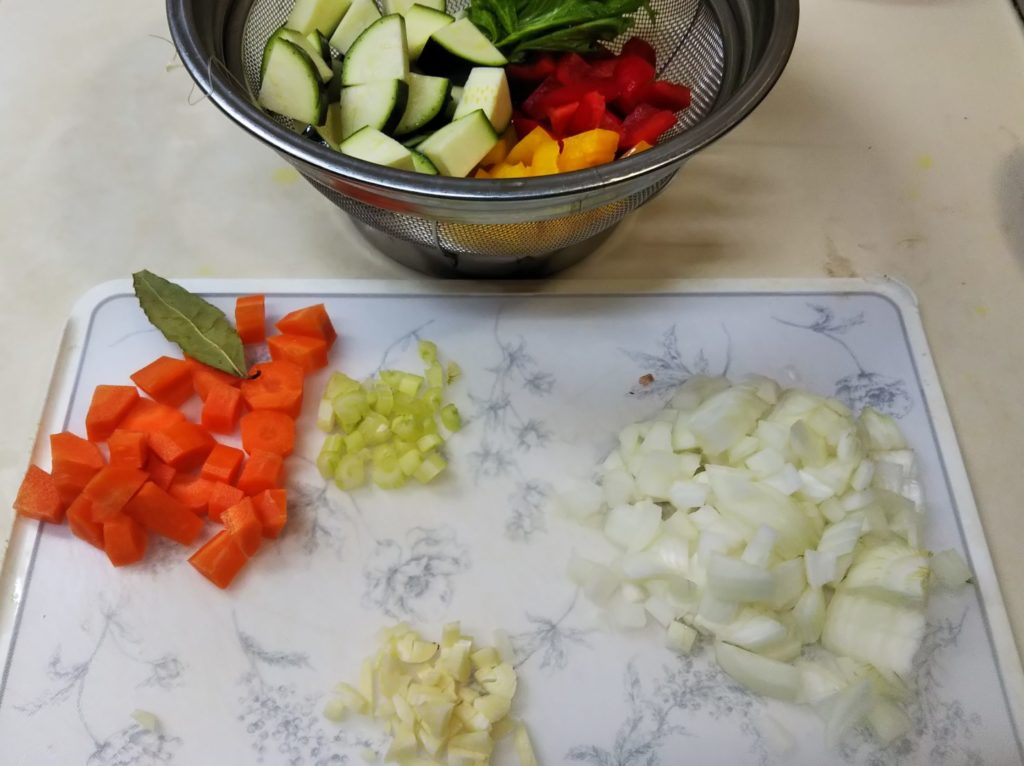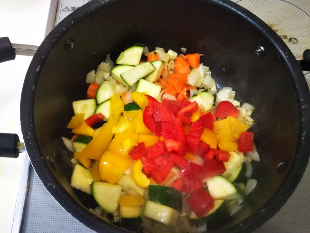 1. ズッキーニは厚さ1㎝位の銀杏切り、パプリカは1.5㎝角、人参と玉葱は1㎝角、ニンニクとセロリの茎は微塵切りにする
