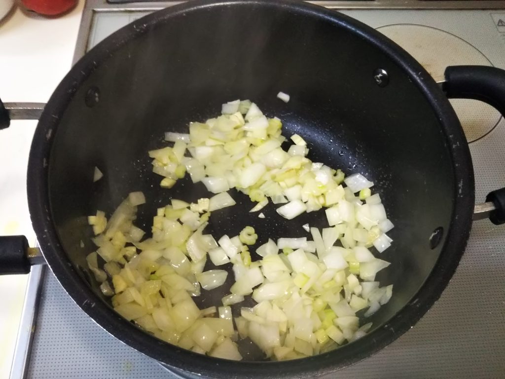 2. 鍋に油を入れて温め、玉葱、ニンニク、セロリを炒める