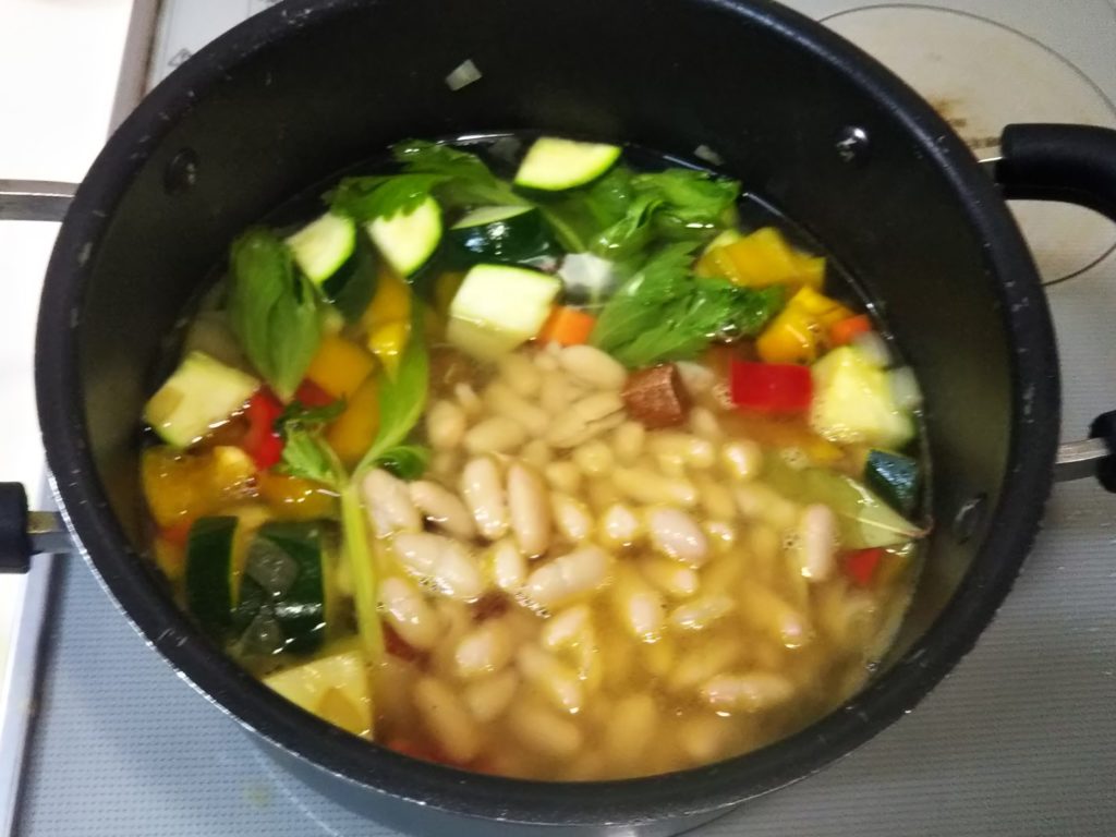 5. 水、ブイヨン、白隠元豆、セロリの葉、ローリエを入れて、沸騰したら弱火で煮込む