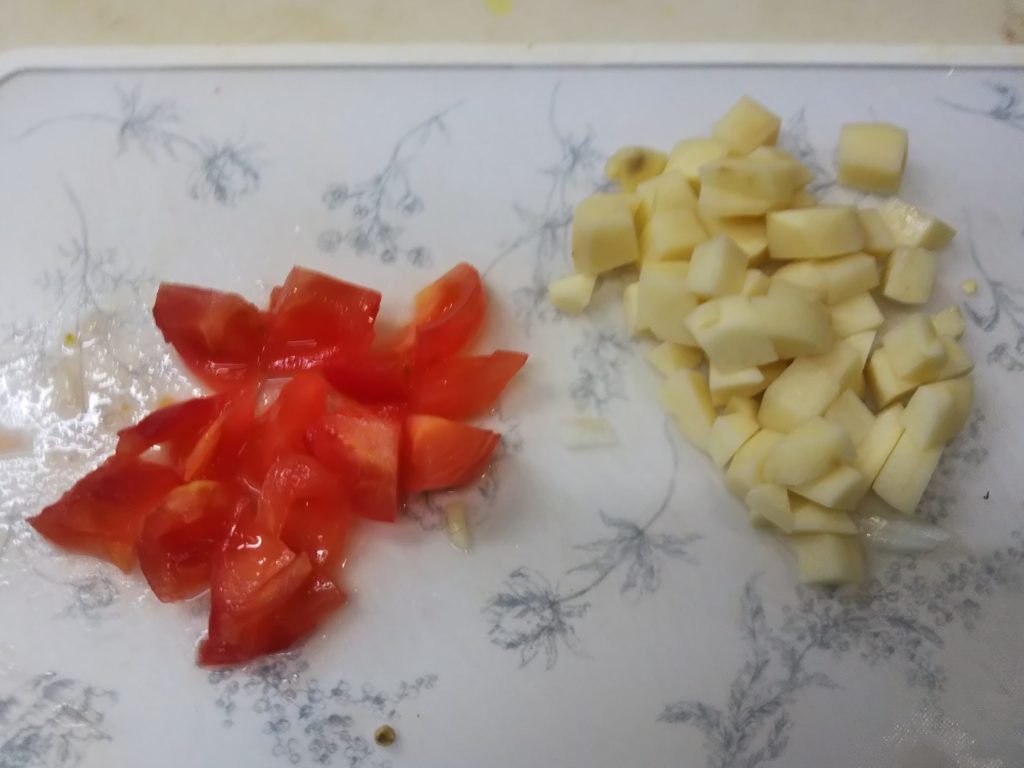 6. 野菜を煮込んでいる間に、トマトは皮を剥いてざく切り、じゃがいもは1㎝角に切る