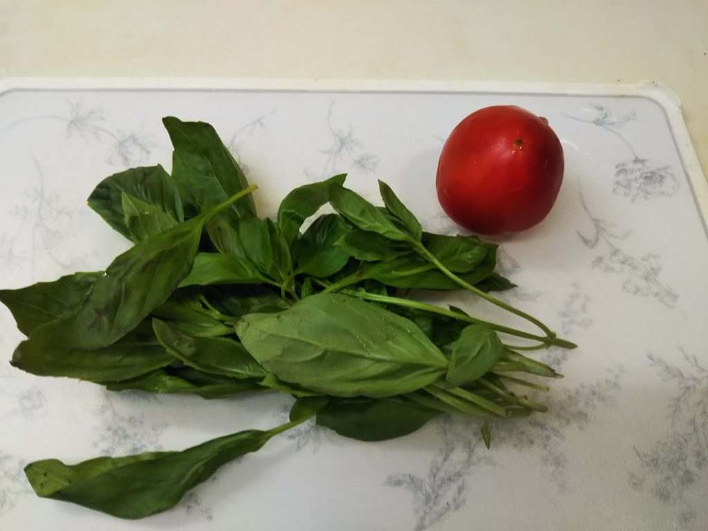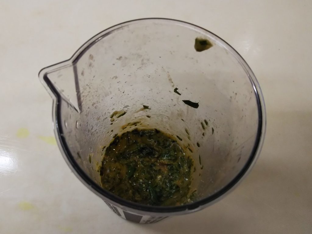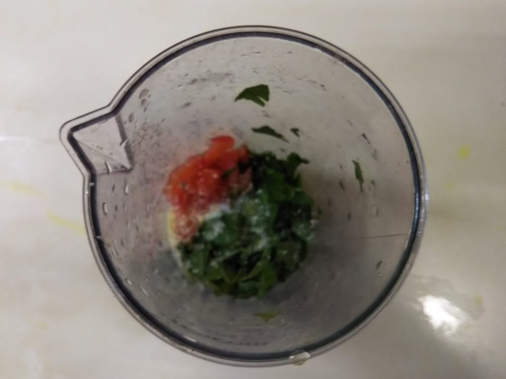 8. ピストゥソースを作る。トマトは皮を剥いて種を取って細かく刻む。バジルも出来るだけ細かく刻む。ソースの材料をブレンダーまたはミキサーに入れて潰す