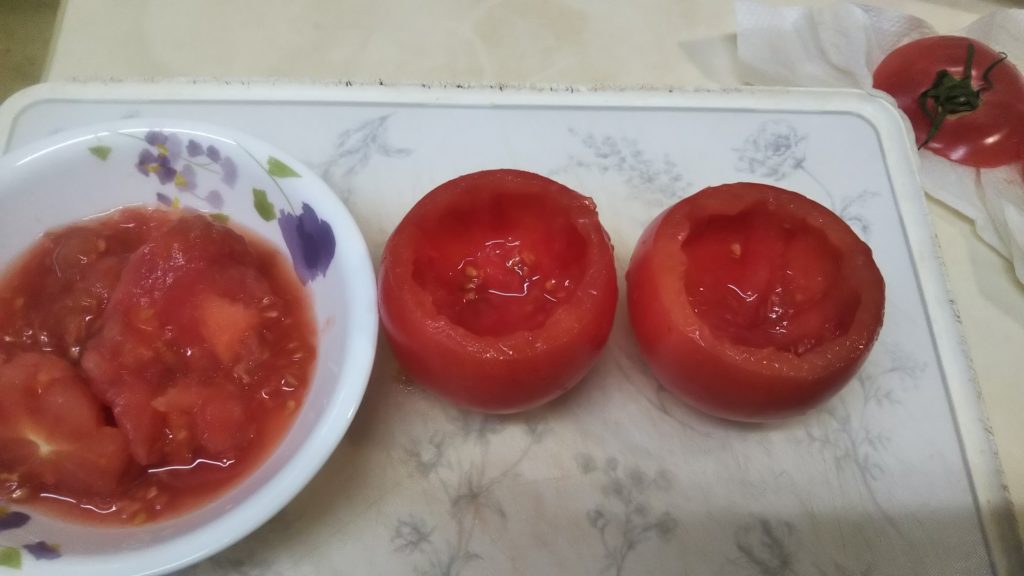 1. トマトはヘタの部分を切り落とし、中身をくりぬいておく