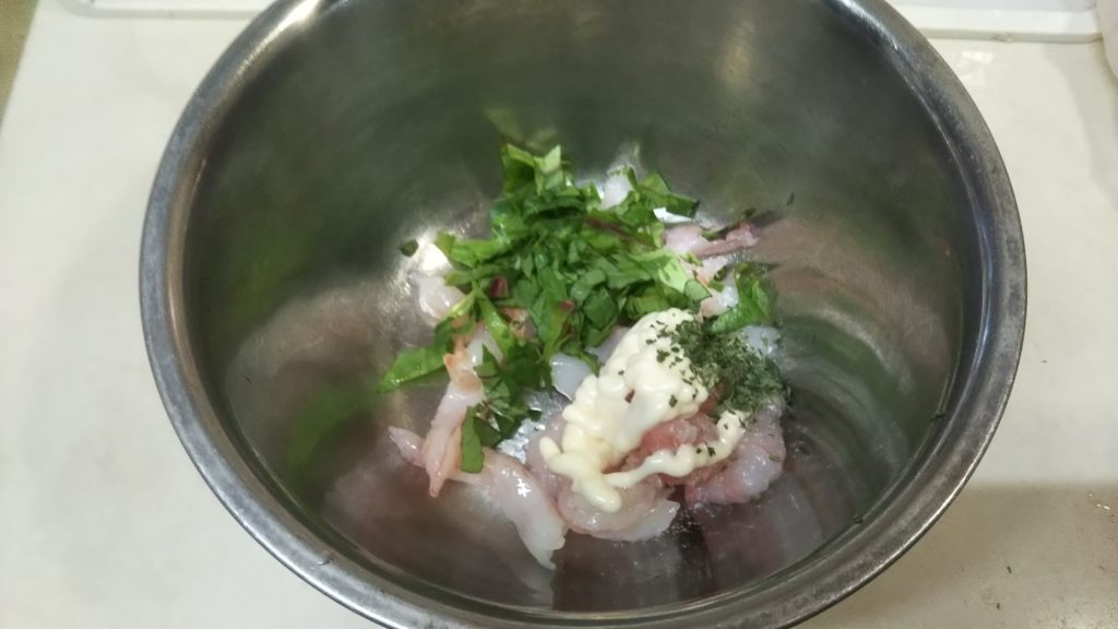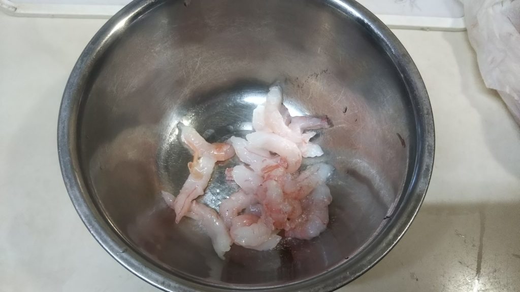 2. 海老は殻を剝いて尾を取り除き、ボウルの奏で白コショウとレモン汁を振りかけておく