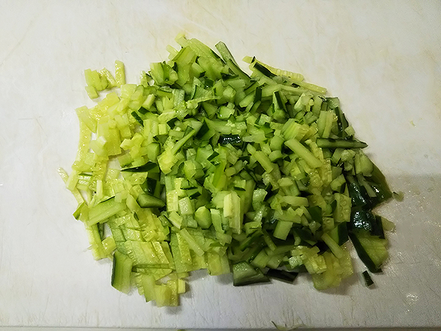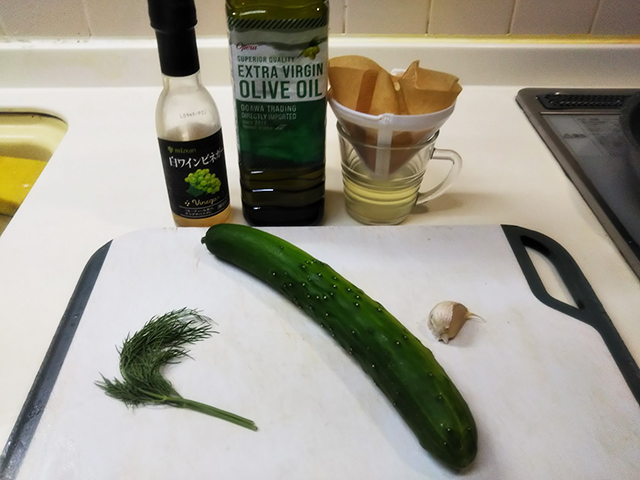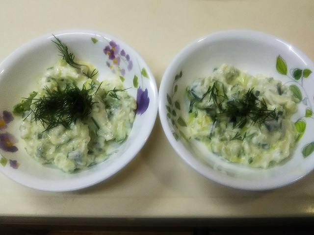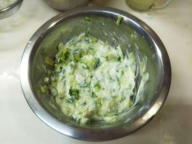 2. 胡瓜は摺り下ろすか細かい千切りにする。ニンニクは摺りおろしておく