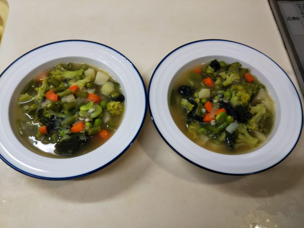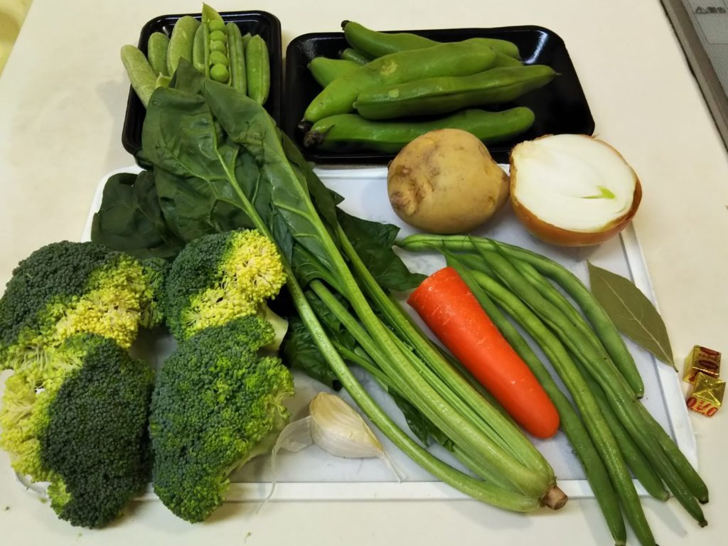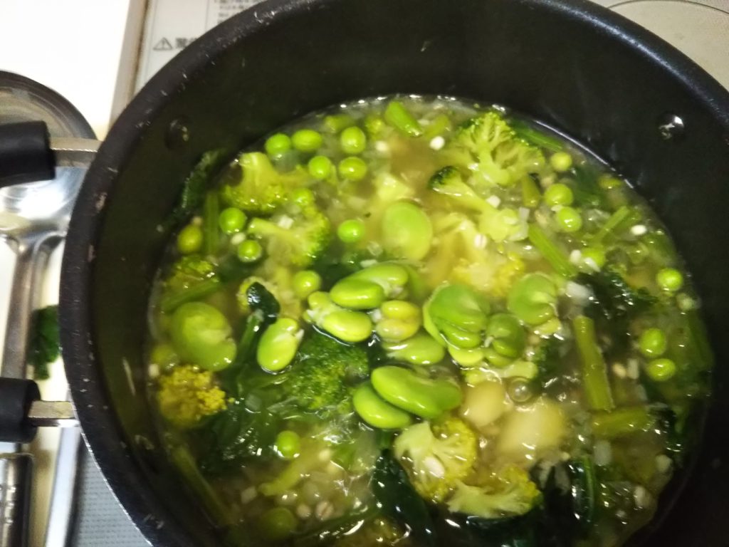 イタリアのスープは具の量によって分類されています。日本の味噌汁のような感じに野菜が入ったスープをミネストラ、豚汁のように具がたくさん入ったスープはミネストローネになります。さらにもっと具がたくさん入ってスープというより粥のようなものをズッパと呼びます。ズッパ・プリマヴェーラはグリーンピースやそら豆などの春野菜、主に緑の野菜がたくさん入ったスープです。野菜の他にパンとかパスタなどを入れるようですが、今回は押麦を少し入れてみました。