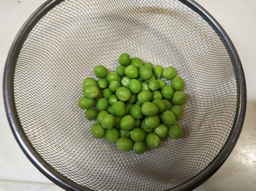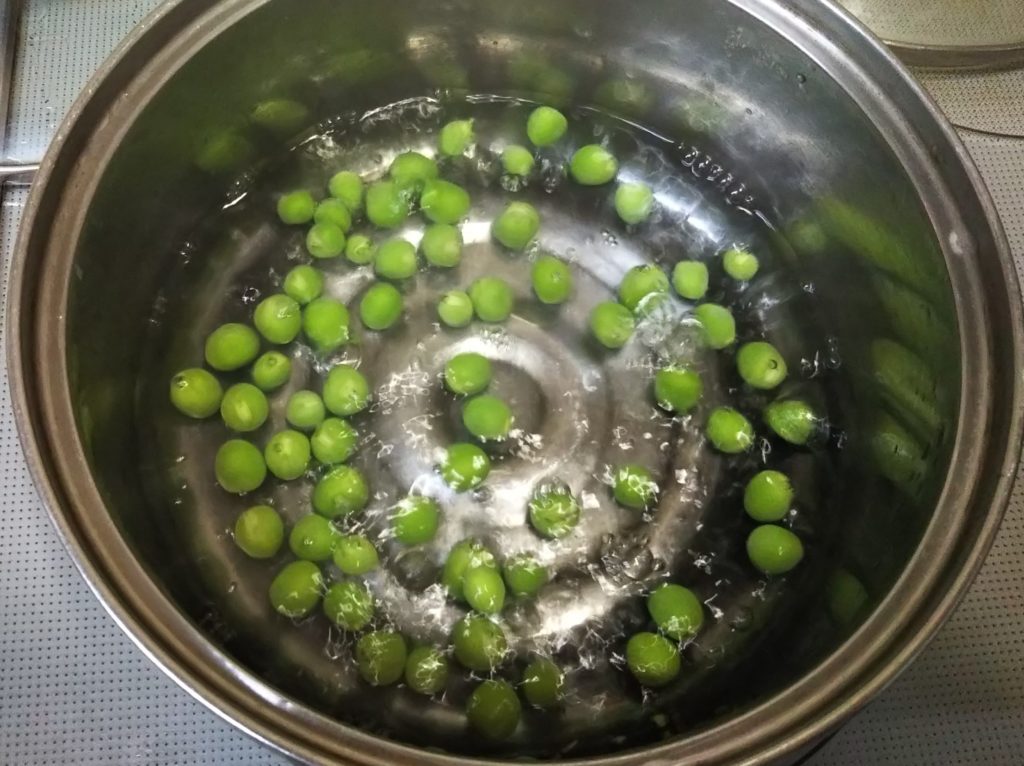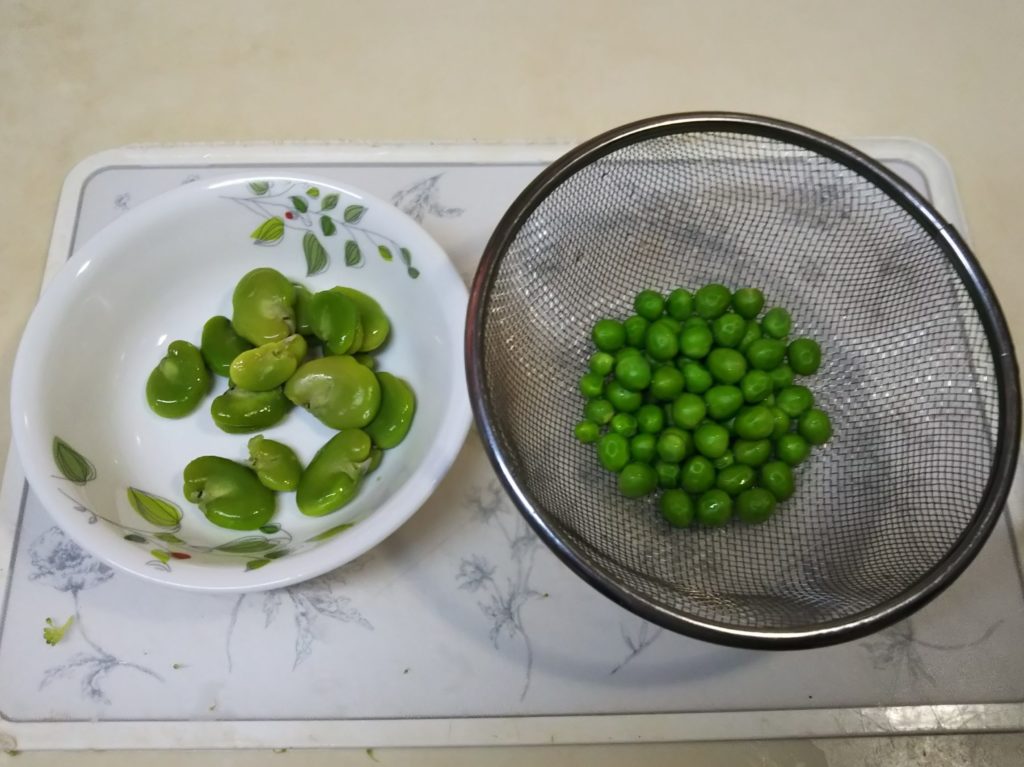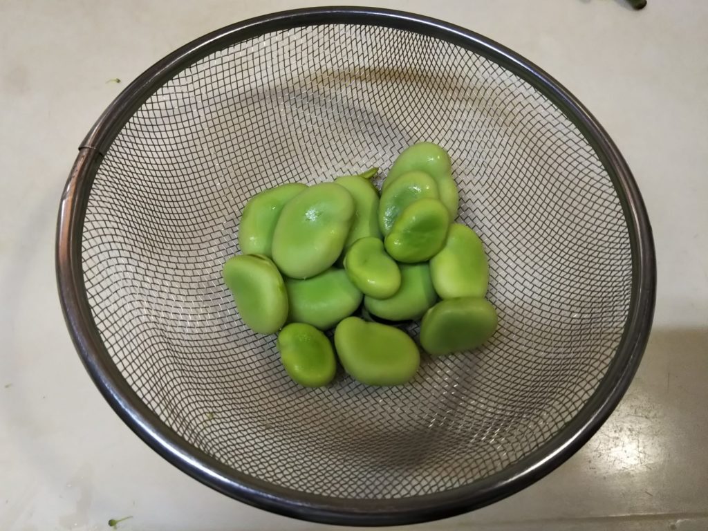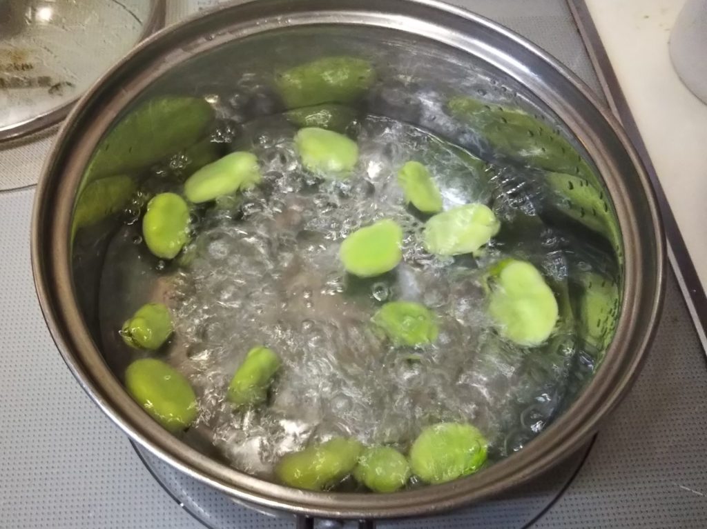 5. 茹でたそら豆とグリーンピースは一旦水に浸して色止めする。そら豆の皮を剥く