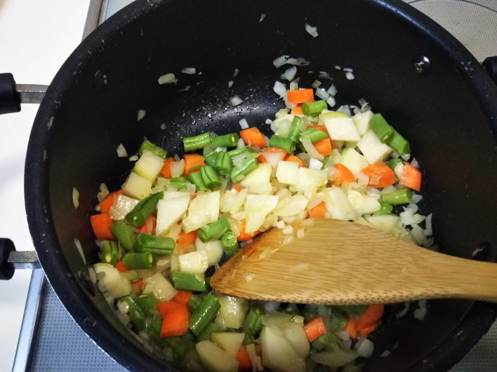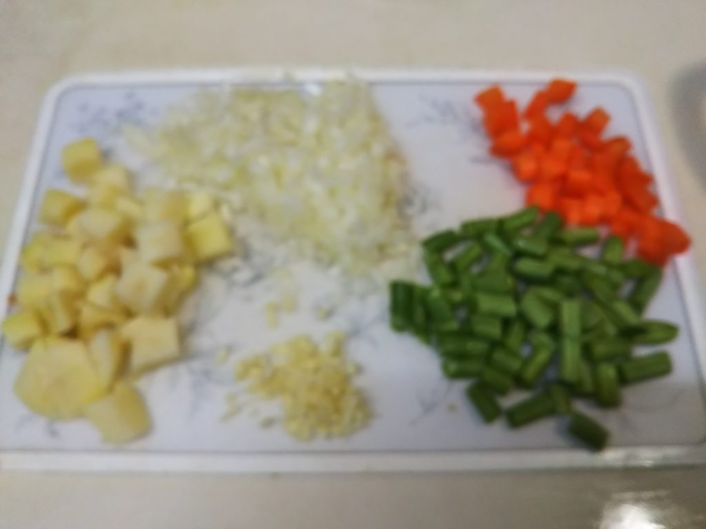 6. じゃがいもとさや隠元は1.5㎝位、人参は5㎜角、玉葱とニンニクは微塵切りにする