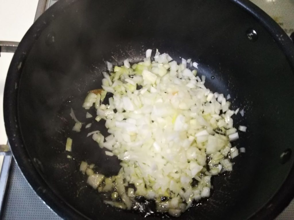 7. 鍋に油を敷いて火にかけ、玉葱を炒める。玉葱が柔らかくなったらニンニクを加える
