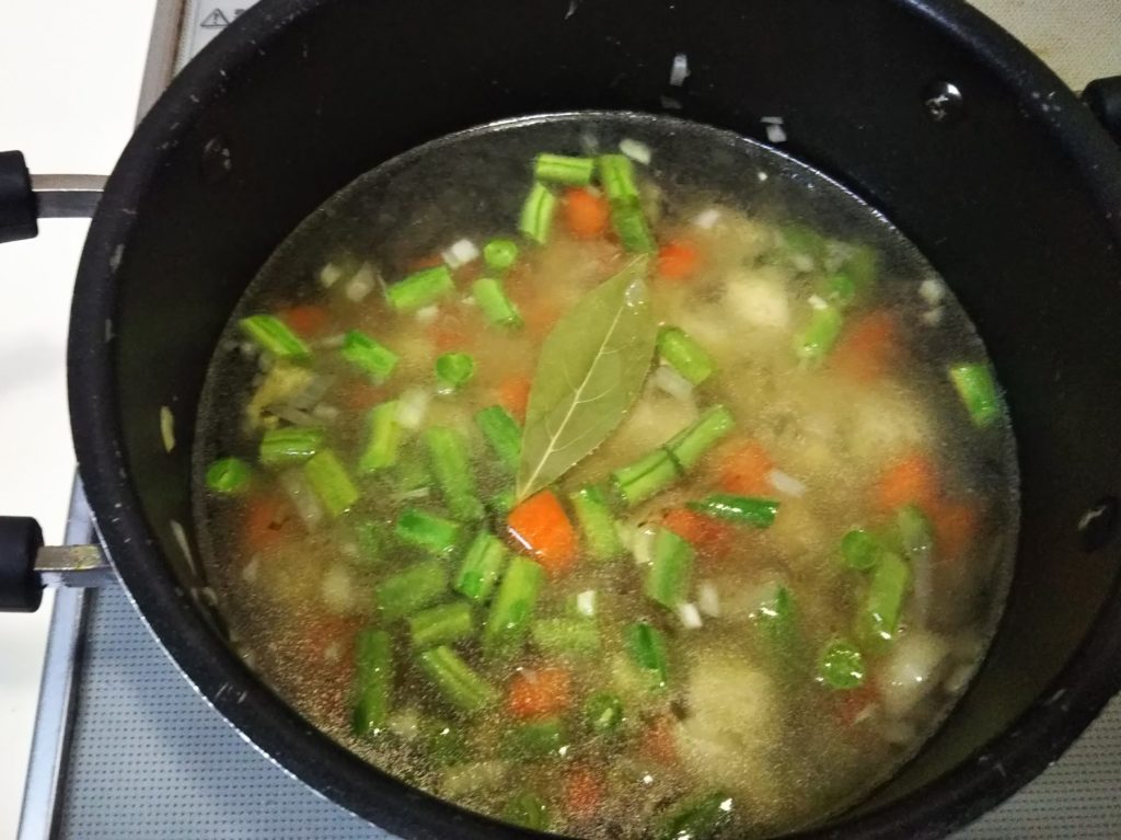 9. 水、ブイヨン、ローリエを加えて沸騰したら弱火で煮込む。煮込んでいる間にブロッコリーとほうれん草を一口大に切っておく
