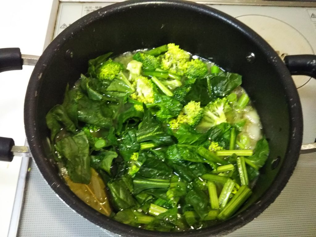 10. 野菜が柔らかくなったらブロッコリーとほうれん草、押麦を加えて更に煮込む