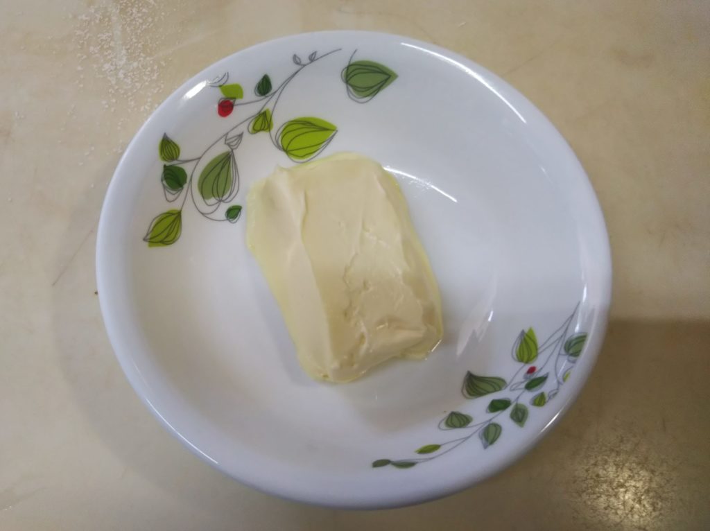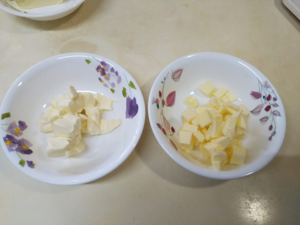 1. 具材用のクリームチーズと生地に入れるバターはサイコロ状に切って冷蔵庫に入れておく