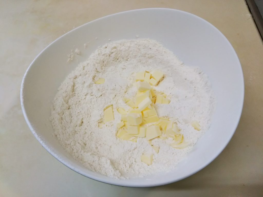 • 通常粉とバターを摺り合わせたあと、すぐに牛乳(液体)を入れますが、このレシピは液体を加えるまで多少時間が空くので、その間冷蔵庫に冷やしておきます