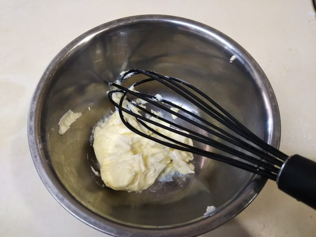 5. 別のボウルに加熱したクリームチーズを入れ、泡だて器で柔らかく練る