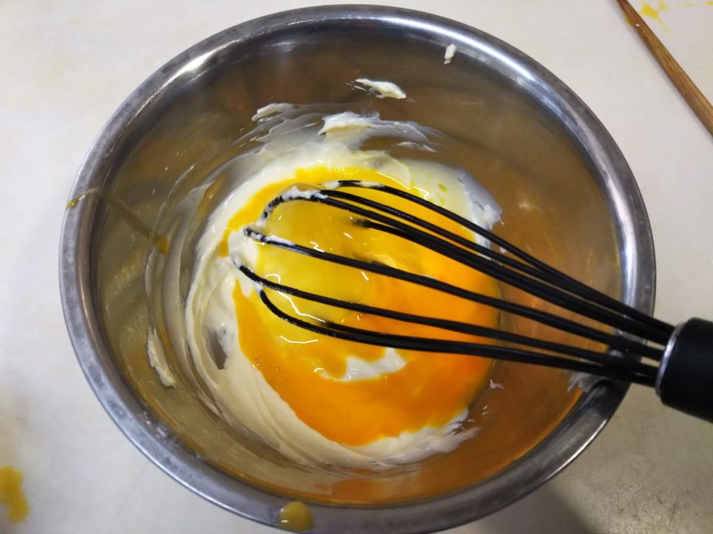 6. チーズがクリーム状になったら溶いた卵を少しずつ加える