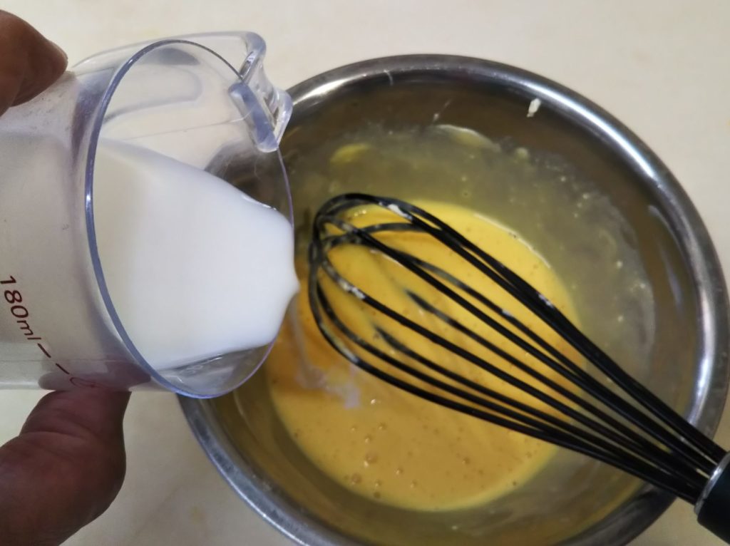 7. 牛乳を少しずつ加えて混ぜる