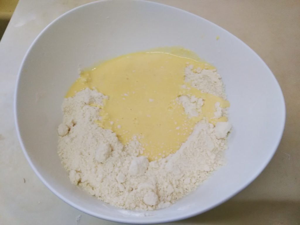 8. 4.の粉の中に7.の液体を加えて、ゴムベラでさっくりと混ぜる