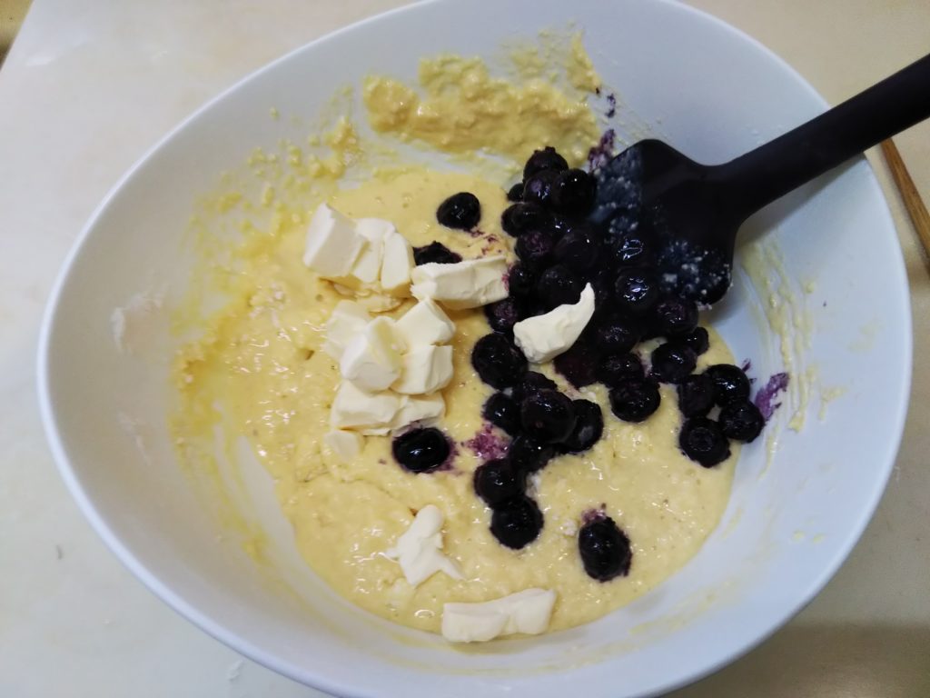 9. 生地の中にブルーベリーとクリームチーズを入れて、さっくりと混ぜる