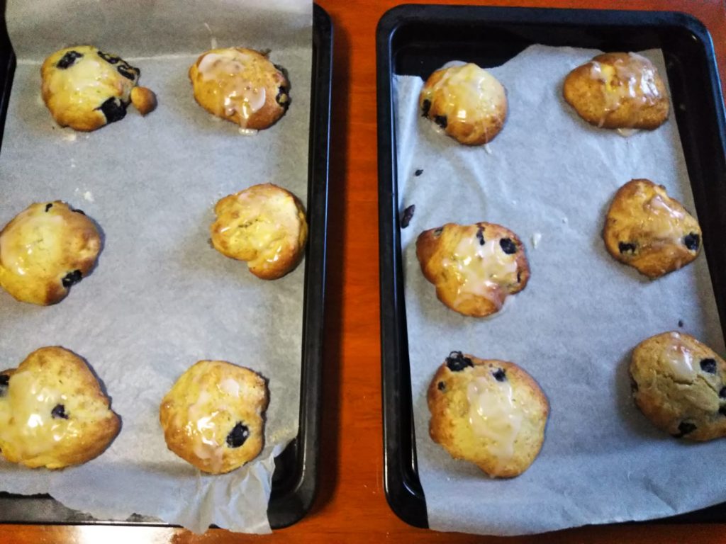 10. スプーンで掬って天板2枚の上に重ならないように並べ、オーブンで約20分加熱する。12分位経った所で天板の上下を入れ換える。焼いてる間に(*)のレモン汁と粉砂糖を合わせてアイシングを作っておく