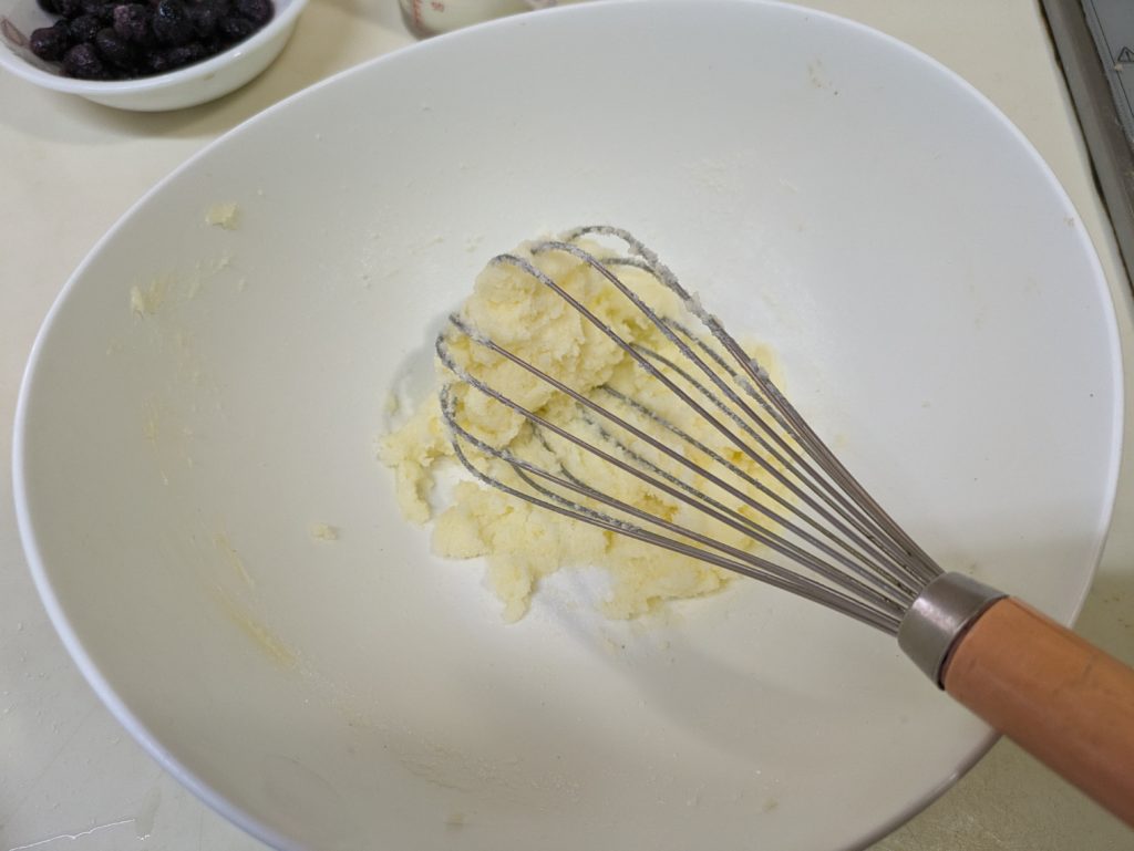 1. バターは室温で柔らかくしておいて、砂糖を少しずつ加えて混ぜ合わせる