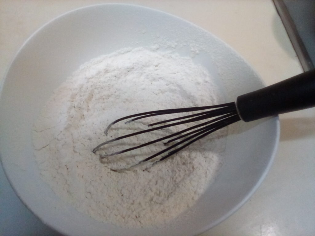 2. 小麦粉とベーキングパウダーを振るい入れたボウルに砂糖を加え混ぜる