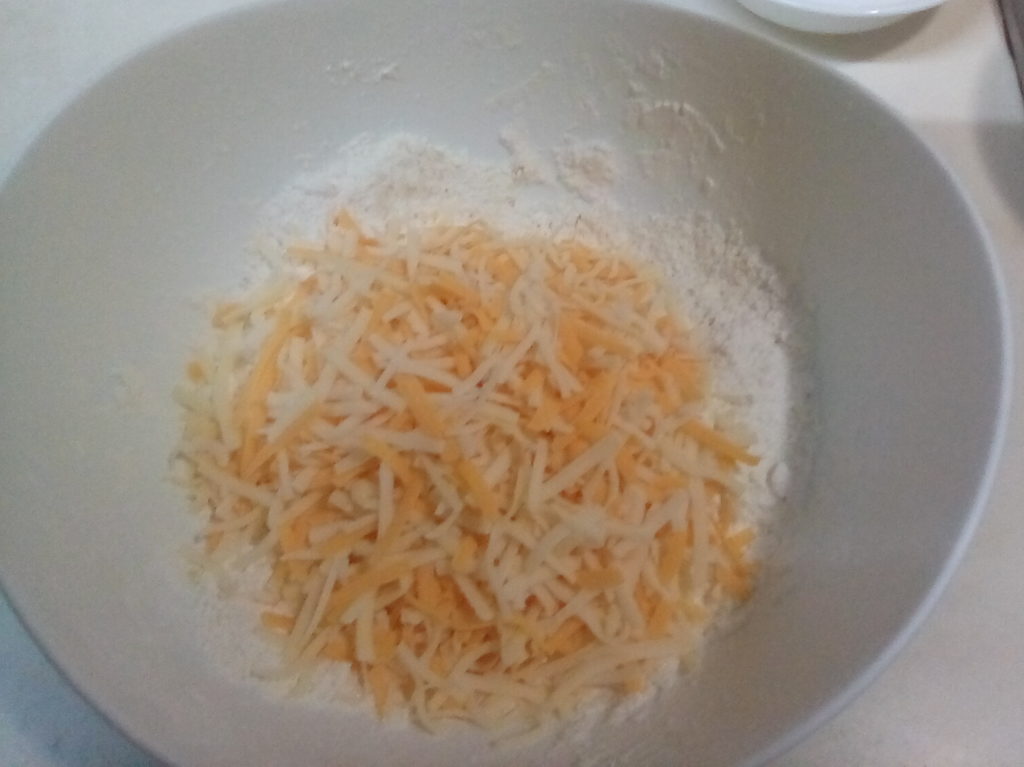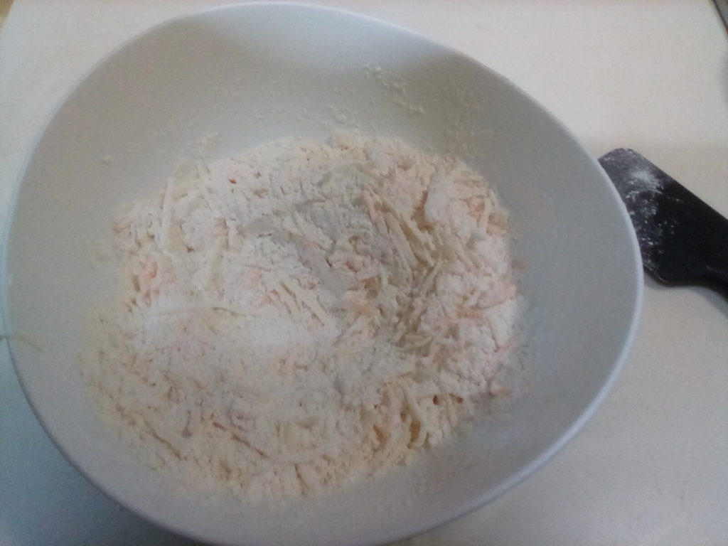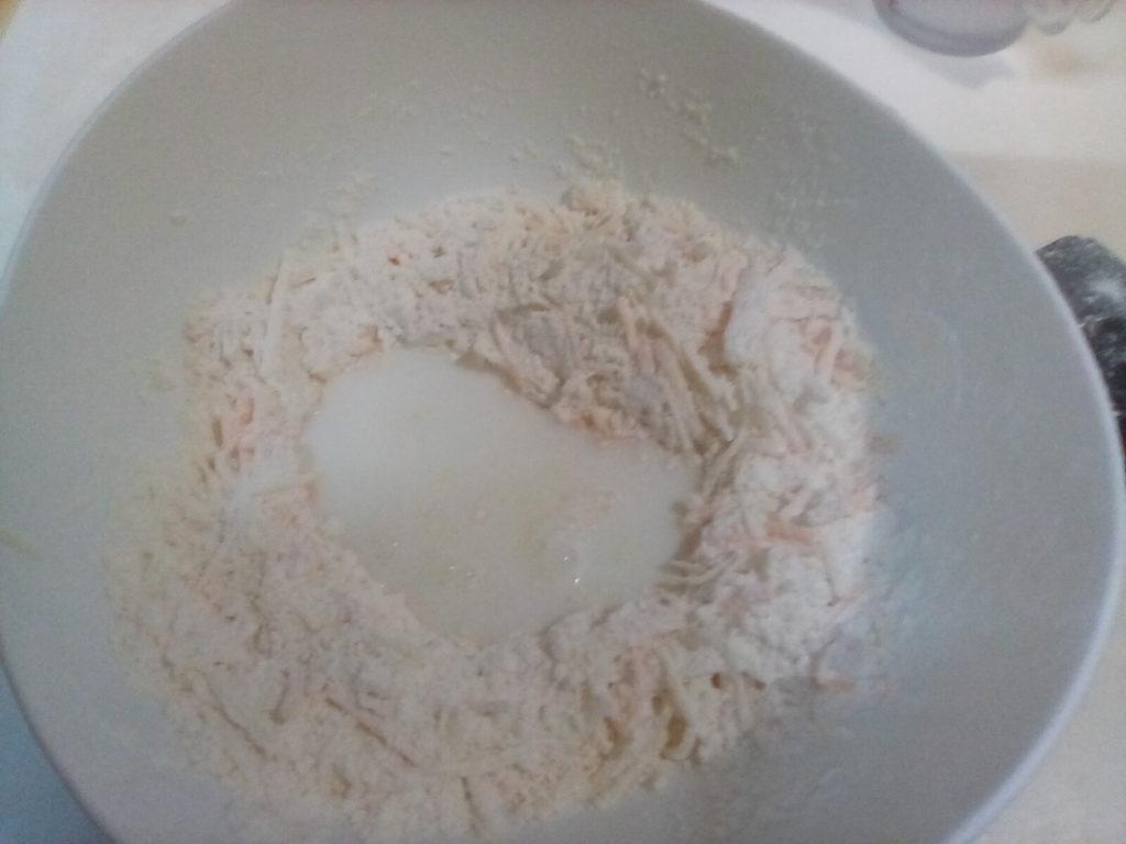 6. チーズと粉がまんべんなく混ざったら、中央に窪みをつくる