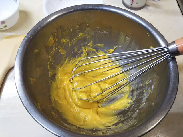 5. 小さめのフライパン、またはソースパンにバターを入れて熱し、焦がしバターを作る。これを生地の中に加えて混ぜる