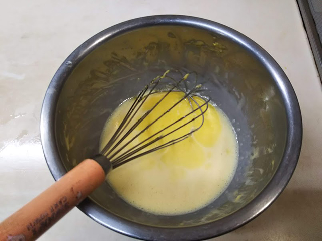 4. 牛乳を少しずつ加えながら混ぜて合わせる