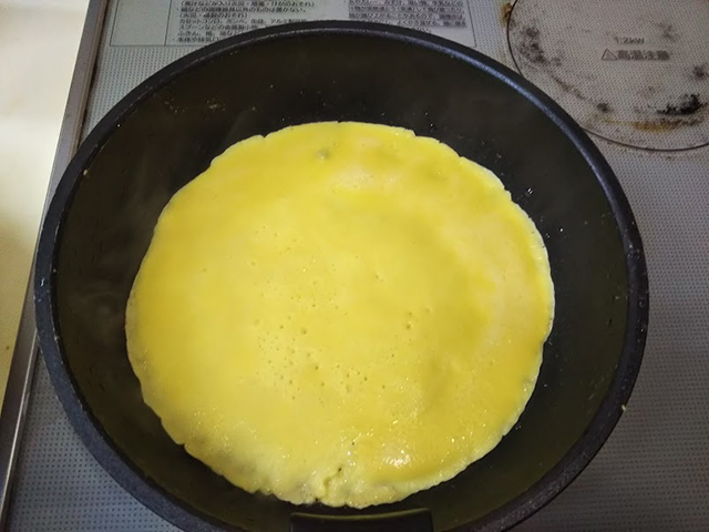 7. 直径20㎝のフライパンに油を敷き、90mlのお玉1杯分の生地を注ぎ入れて焼く